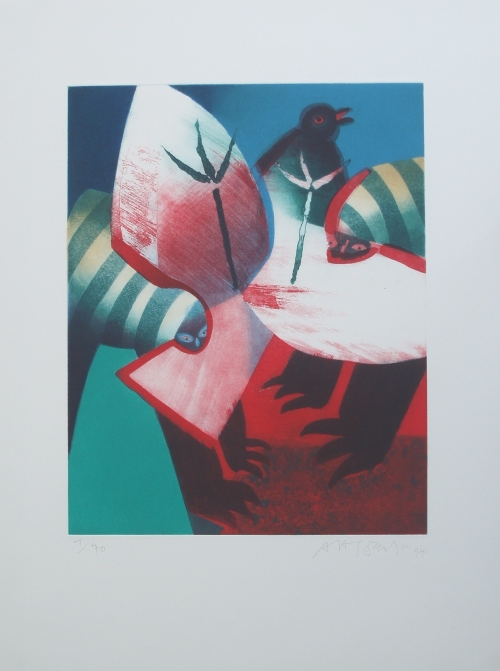 Arne Haugen Sørensen begyndte som grafiker i Paris i 1950'erne. Fra de tidlige religiøse og sociale motiver bevægede han sig frem mod et mere abstrakt udtryk, som rummer en skjult verden af dyriske væsner og figurer. Fra midten af 1970'erne har han bl.a dyrket motivkredse som Dyr og damer, herunder en serie på 6 farvetræsnit fra 1979, der regnes for hans grafiske hovedværk. Disse dramatiske billeder handler om rovdyret, der forfølger eller overfalder det kvindelige offer.