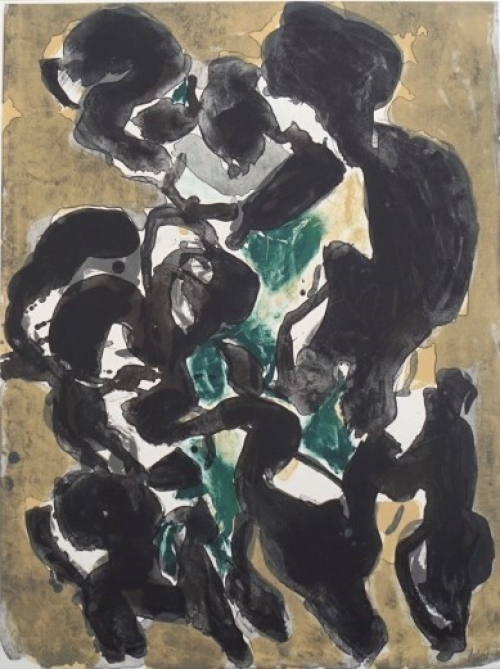 Mogens Andersen - Stor komposition i sort, umbra, gul, grøn og grå farver. Stentryk i 5 farver, 1996. Uindrammet