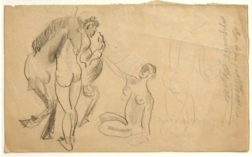 I tegningen "Mytologisk scene med en hest og to kvinder" fra 1916, spores der tydelig inspiration fra El Grecos ekstatiske stil.